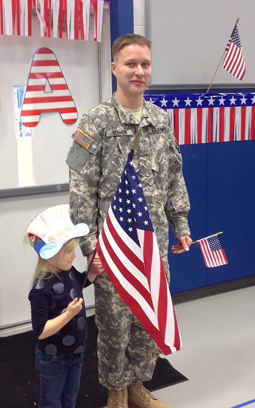 As music teacher Holly Collums announced a special guest, both girls showed shock and surprise as their dad entered. After lengthy hugs and tears, and a few moments to reconnect, the Schade family was serenaded by 250 children and adults singing “God Bless America” in Lieutenant Schade’s honor.